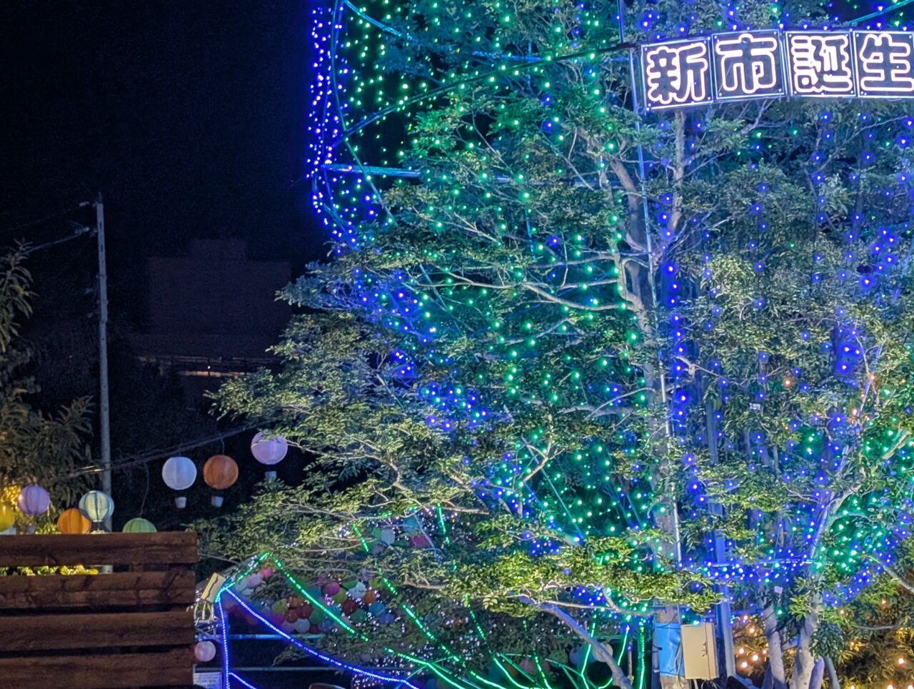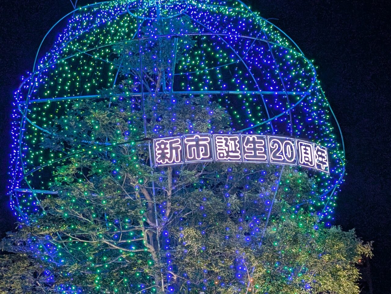 今年は「新市誕生20周年」、唐人町緑道広場ではバルーンを象った光のオブジェに新市誕生20周年と書かれています。