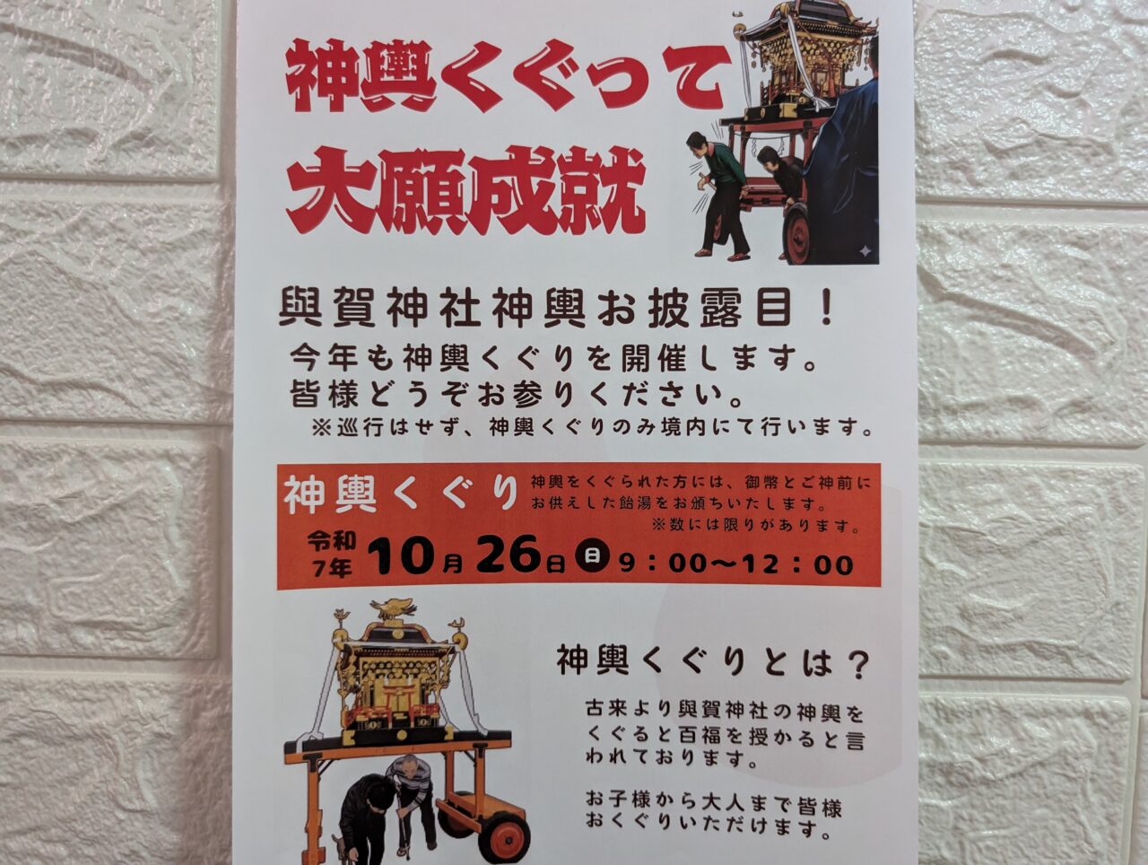 また10月26日(日)には同境内で神輿くぐりが開催されます。9:00から12:00まで行われますのでぜひこちらもご参加ください。