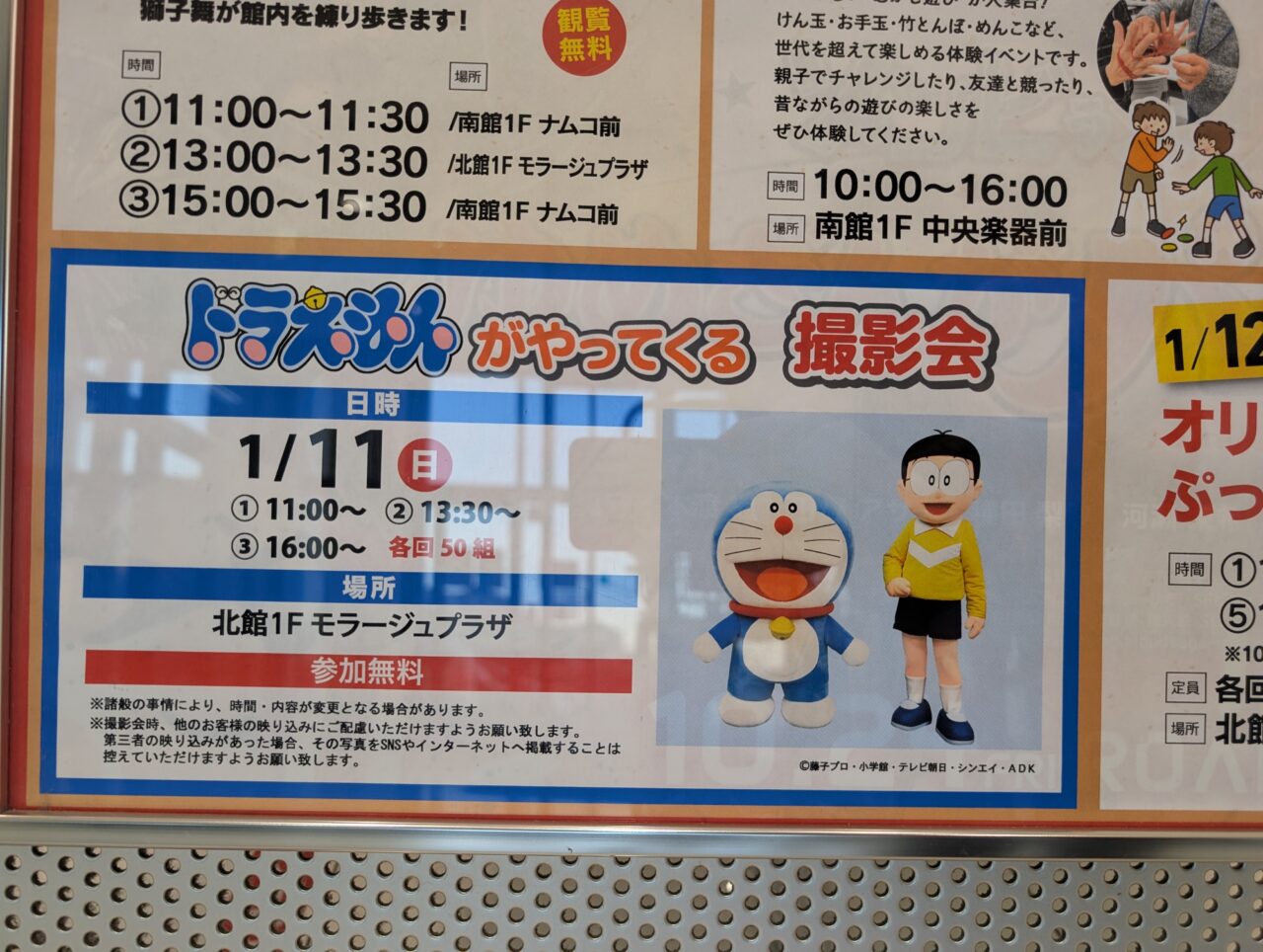 撮影会への参加には、当日配布される整理券が必要。整理券は各日とも午前10時から、北館1階モラージュプラザで配布され、各回50組限定(1組4名まで)となっています。撮影は整理券に記載された時間に行われ、1組につき1カット程度。キャラクターへの接触やポーズ指定、動画撮影はできませんのでご注意ください。
