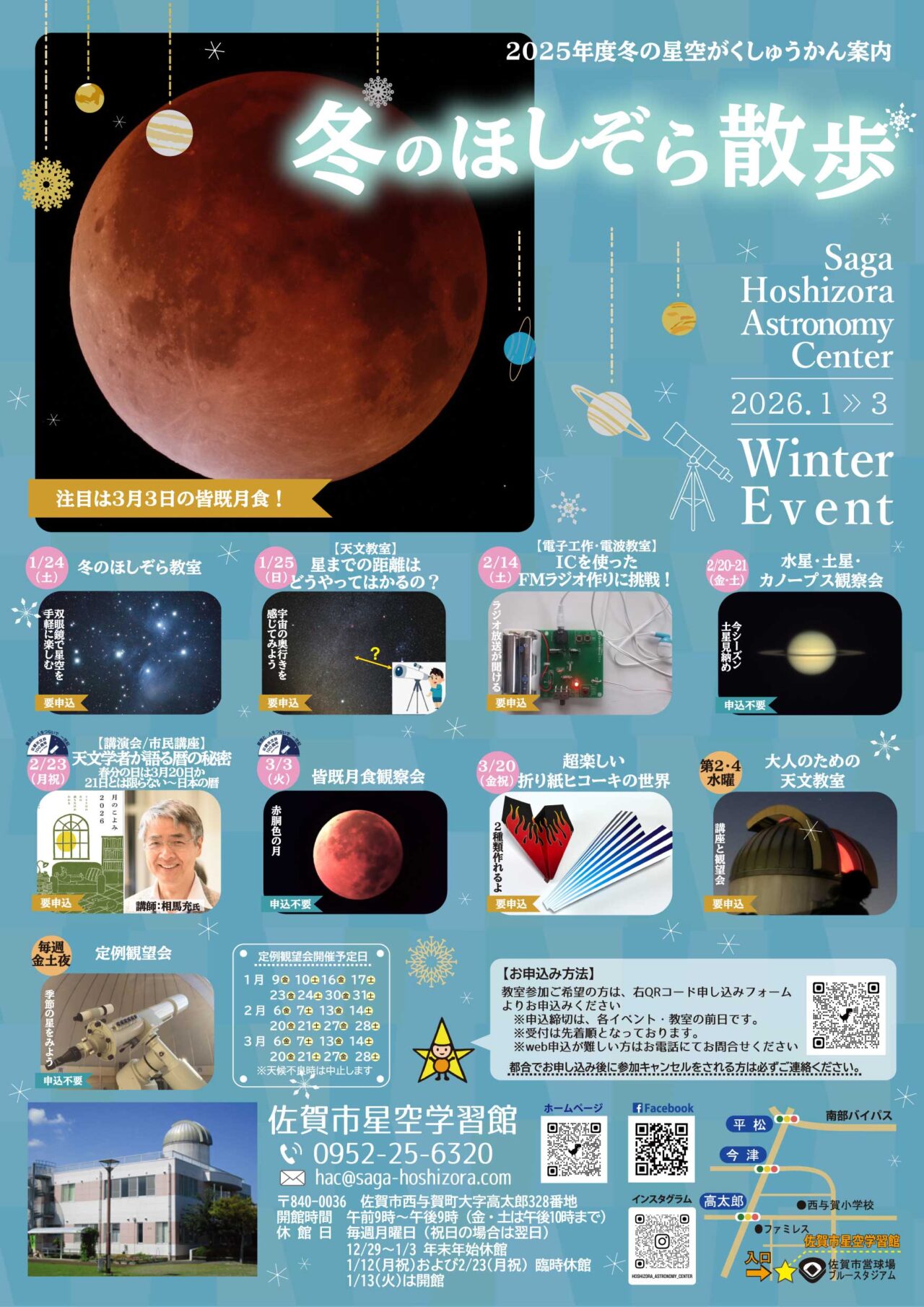 星や宇宙、科学の世界を身近に感じられる「佐賀市星空学習館」から、この冬から春にかけて楽しめるイベントのお知らせです。