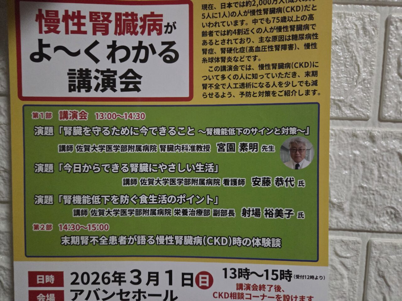 2026年3月1日(日)、慢性腎臓病(CKD)について正しく学べる講演会が開催されます。主催はNPO法人 佐賀県腎臓病協議会。近年、患者数が増加している慢性腎臓病は、自覚症状が少ないまま進行し、気づいたときには人工透析が必要となるケースも少なくありません。だからこそ「早く知ること」「正しく予防すること」が何より大切です。