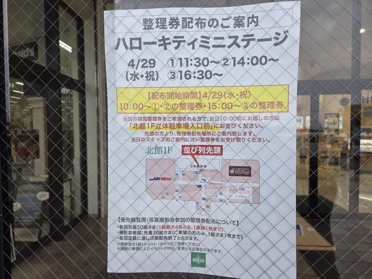 当日は、優先観覧席および写真撮影会参加のための整理券が配布されます。①②の回は10時から、③の回は15時から配布開始。場所は北館1階モラージュプラザ周辺となっています。